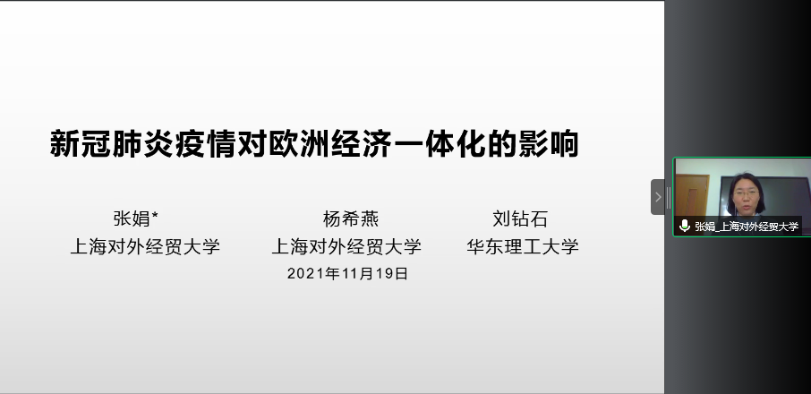 11月19日张娟副研究员参加四川大学欧洲问题研究中心、欧盟让·莫内最佳欧洲研究中心、教育部区域研究基地-四川大学欧盟研究中心、四川大学经济学院联合主办的“理解欧洲一体化的未来愿景”学术研讨会线上会议,发言题目:《新冠肺炎疫情对欧洲经济一体化的影响》。