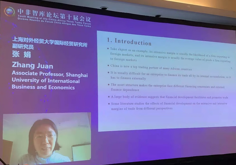 10月21日,张娟参加中非合作论坛中方后续行动委员会秘书处主办,浙江师范大学、浙江省人民政府外事办公室、塞内加尔谢赫·安达·迪奥普·达喀尔大学联合承办的中非智库论坛第十届会议线上会议,在第一分议题“中非合作论坛新规划与中非命运共同体构建”发言,发言题目:“Impacts of Financial Development on Trade Margins: Evidence from China-Africa Trade”。