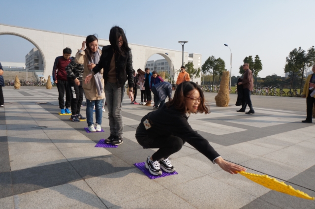 随着谈书记一声令下,比赛正式拉开了帷幕。本次比赛是从集合地学校大操场出发,首先是就地进行第一个任务“气球三明治”,即每组派两名成员背夹气球走完十米赛道并在终点踩爆气球,完成后通过猜谜语找出第二个任务点篮球场进行“投五个羽毛球入框”,完成后再通过猜谜语找出第三个任务点学思楼门洞前进行“抽指令摆造型拍照”,完成后最后一次通过猜谜语找出第四个任务点六百万进行“高山流水”,即小组成员用道具组成轨道接力将乒乓球运送至指定小桶内即算完成。第四个任务完成后,各小组先后来到了最后位于南广场的任务点完成“摸石过河”,即各小组的5个成员排成一列,边铺垫子边接力前进到达指定位置。