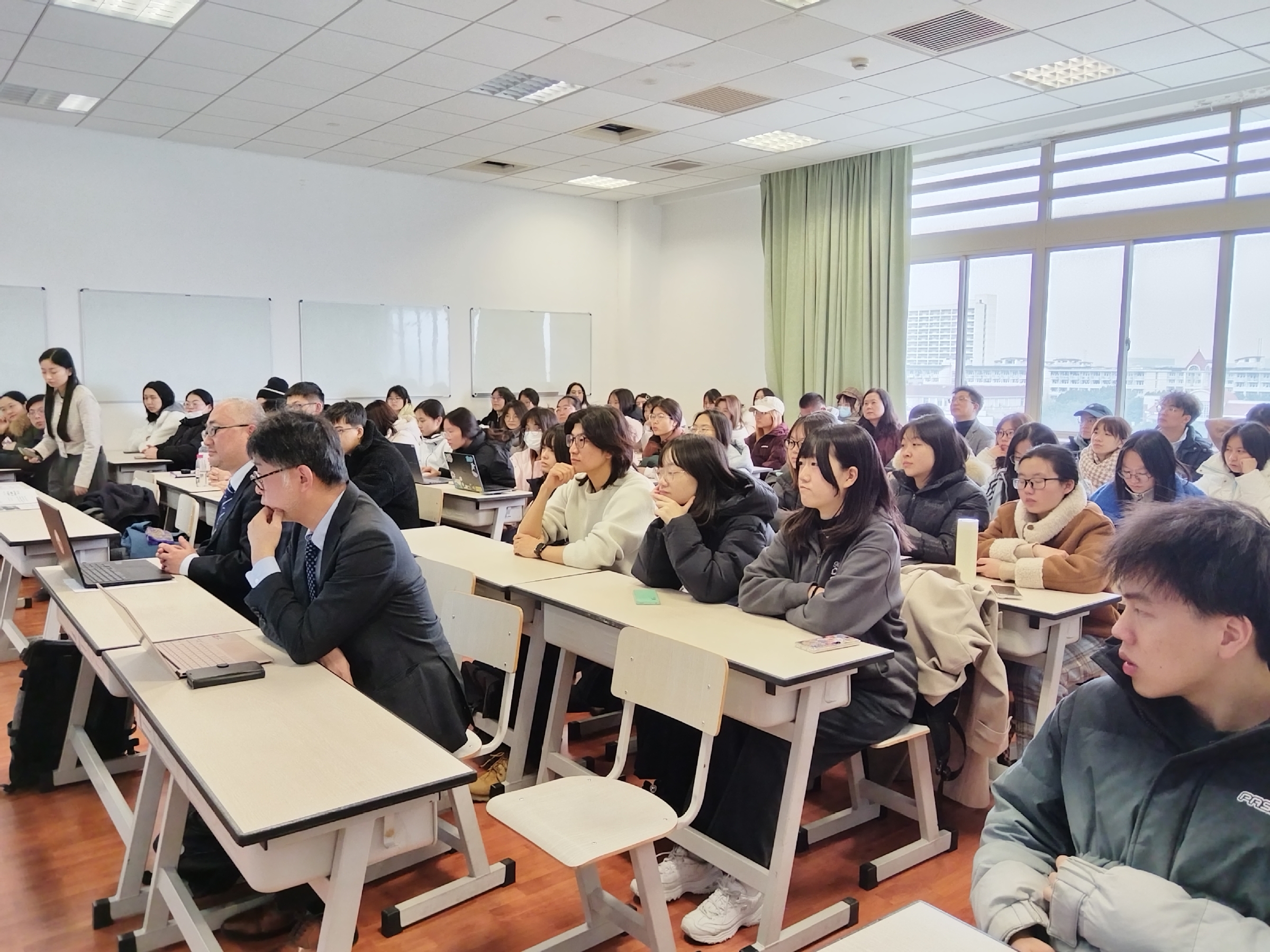 当天下午,吉田广毅副校长及高井启介教授还为学校日语系师生带来一场关于横滨风物和日本动漫文化的精彩讲座。讲座过程中,两位教授与在场学生展开了热烈互动,他们详细解答了学生们关于日本动漫产业和横滨历史文化的提问,并分享了个人的经验与见解,现场气氛活跃。