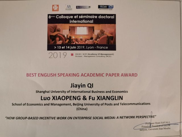 美国管理学学会(Academy of Management,AOM) 管理咨询分会 (Management Consulting Division, MCD)2019年国际会议暨博士生论坛(AOM MCD 8thINTERNATIONAL CONFERENCE AND DOCTORAL CONSORTIUM)于6月13日到14日在法国里昂的里昂第三大学举行。本次会议主要议题包括:变革管理的理论与实践、增强理论与实践关系的方法研究、变革管理绩效评估等。会议允许提交法文、英文、西班牙文三种语言的论文。会议录用论文179篇,参会人数200多人,覆盖全球四大洲的三十个多个国家和地区。必赢626net入口首页齐佳音教授应邀出席会议并报告了研究团队合作完成的英语论文“How group-based Incentive work on enterprise social media: a network perspective”(群体激励如何在企业社交媒体中发挥作用:网络的视角),该论文获得本次会议最佳会议英文学术论文奖。