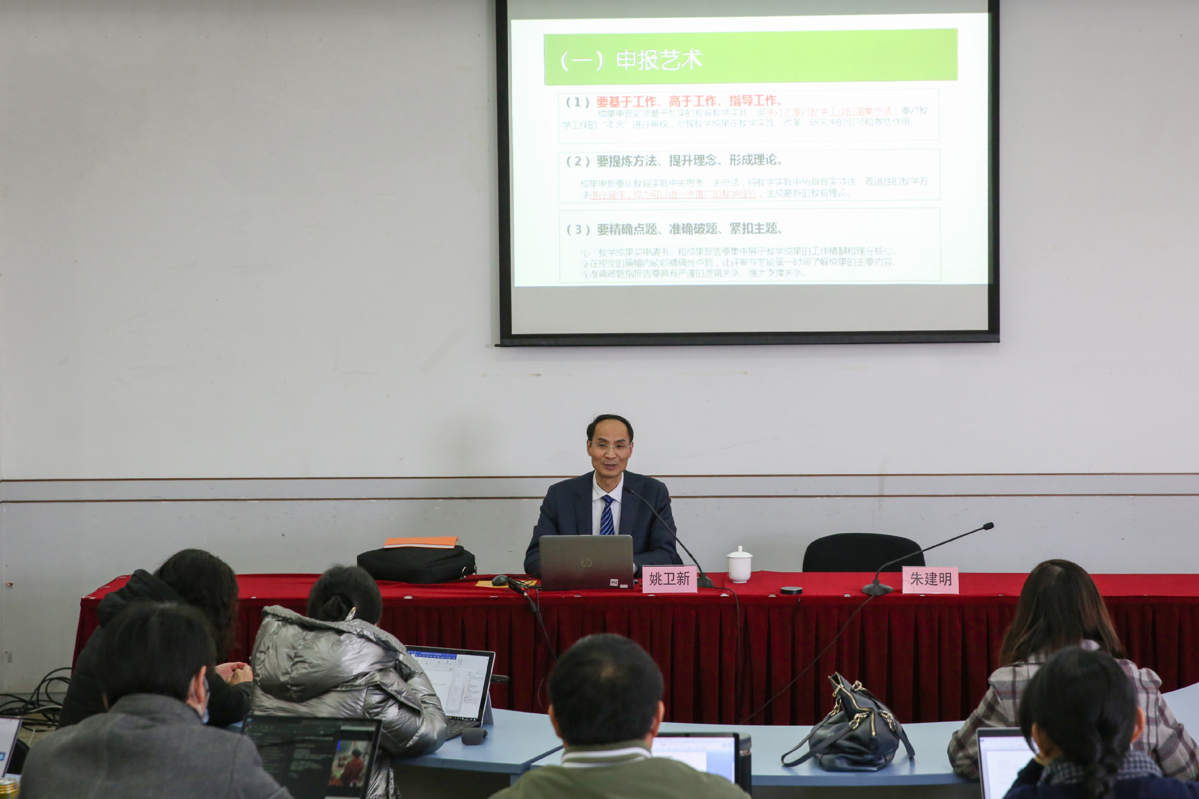 随后,姚卫新教授重点讲述了如何撰写成果奖申报书。他提出,成果申报必须基于扎实的教育教学实践,不是对教学工作的简单总结,而要对教学工作的“本元”进行审视,发挥教学成果在教学实践、改革、研究中的引领和激励作用。在内容上,成果申报要从教育实践中去思考、去总结,将教学实践中所具有实效性、普适性的教学方法进行凝练,成为可以进一步推广的教学经验,生成最新的教育理论,并能精确点题、准确破题、紧扣主题。最后,姚卫新教授整理了申报思路,并从成果简介的写法、成果解决教学问题的方法、成果的创新点和成果的推广应用效果等四个方面具体阐述了申报书的撰写技巧。