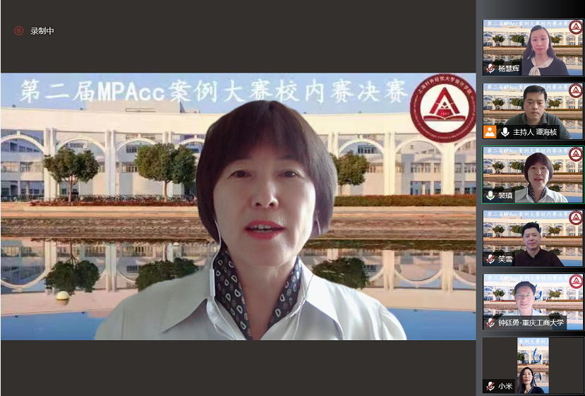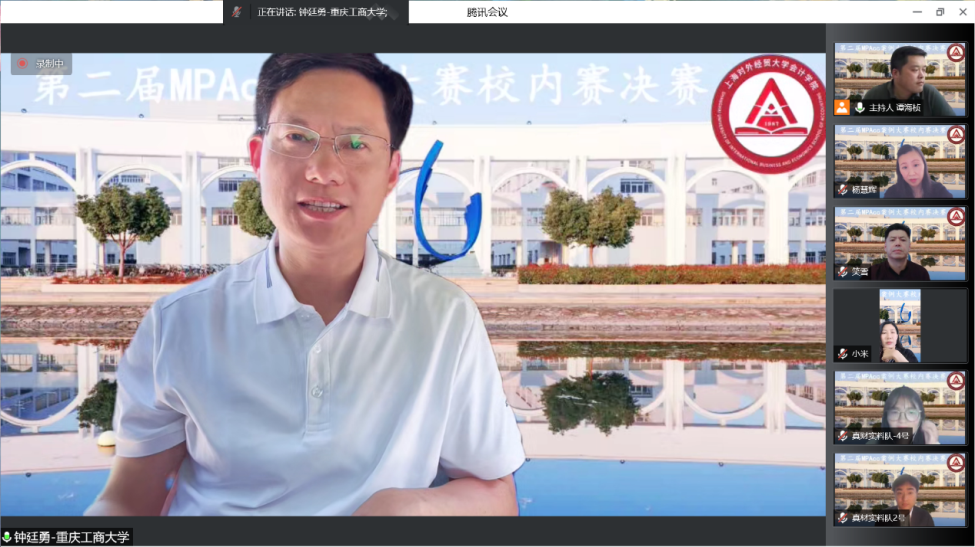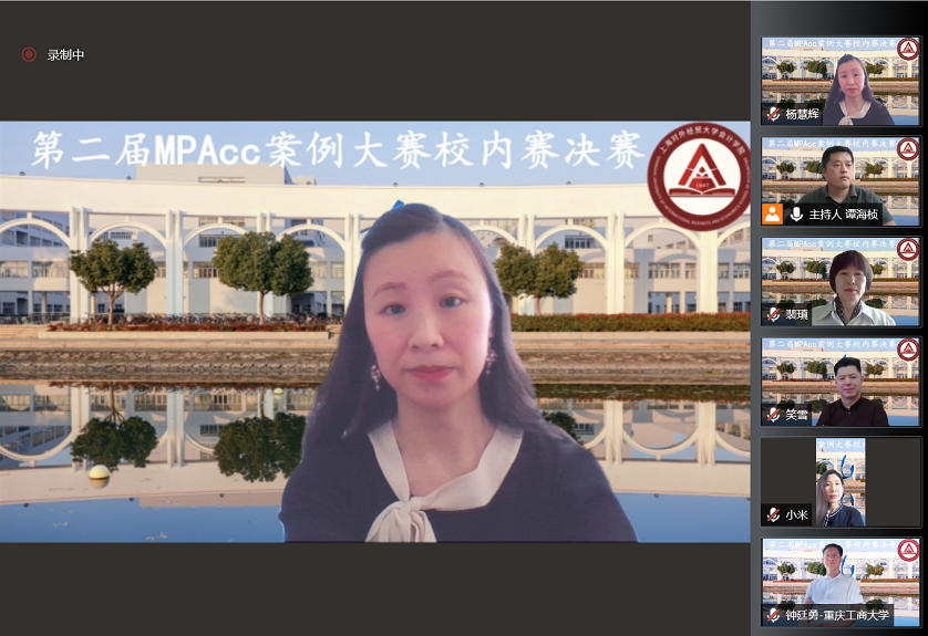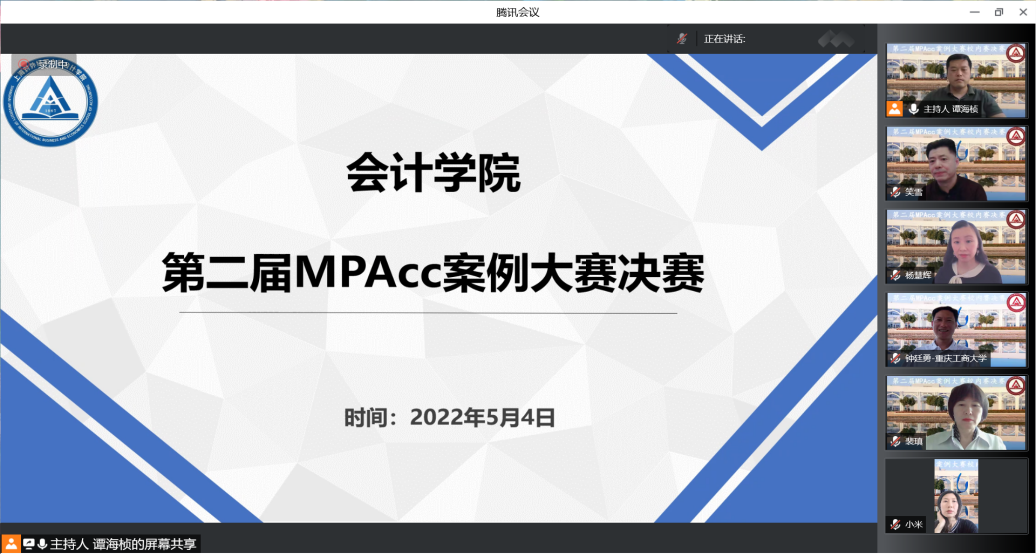 5月4日,大赛决赛在腾讯会议云端会议室精彩呈现。重庆工商大学会计学院副院长钟廷勇教授、《会计之友》杂志社社长/总编笑雪先生、普华永道中国会计专业技术部合伙人符文娟女士出席并担任评委,会计学院院长裴瑱教授、副院长杨慧辉教授、以及会计专硕研究生和导师参加本场决赛。决赛由MPAcc教育中心副主任谭海桢主持。