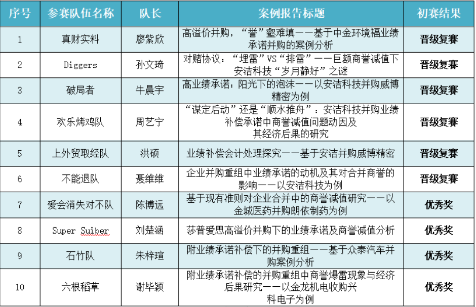 受新冠疫情的影响,第二届MPAcc案例大赛自去年10月启动,至今已历时7个月。比赛共38支团队参赛,参赛人数140余人,占到全日制MPAcc研究生人数2/3,极大地激发了会计专业硕士的案例研究热情。参赛团队根据本次大赛的主题调研选择案例企业,认真讨论案例结构,在指导老师的带领下融入具体公司情境和角色,把财务、会计原理和实际案例融合起来,反复斟酌修改案例报告并形成最终成果。经过初赛案例报告撰写、校外专家双盲评审,评选出10强。前6名的队伍晋级复赛,第7-10名的队伍将荣获优秀奖。