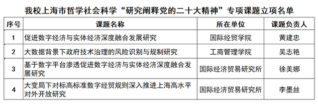 经专家评审、社会公示并报上海市哲学社会科学工作领导小组批准,上海市哲学社会科学“研究阐释党的二十大精神”专项课题立项名单于1月30日正式公布,共计立项59项,其中必赢626net入口首页共4项课题获得立项。