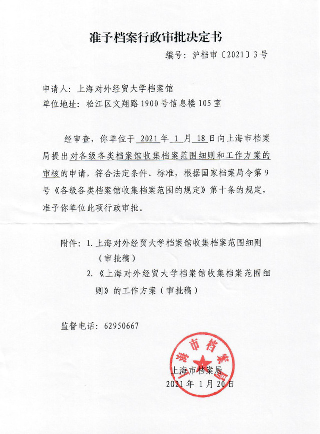 2021年1月20日,《必赢626net入口首页档案馆收集档案范围细则》(以下简称《细则》)以及工作方案通过上海市档案局审核批准(沪档审[2021]3号)。