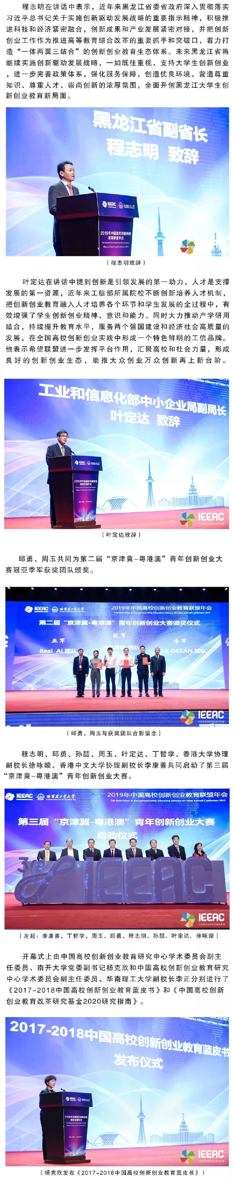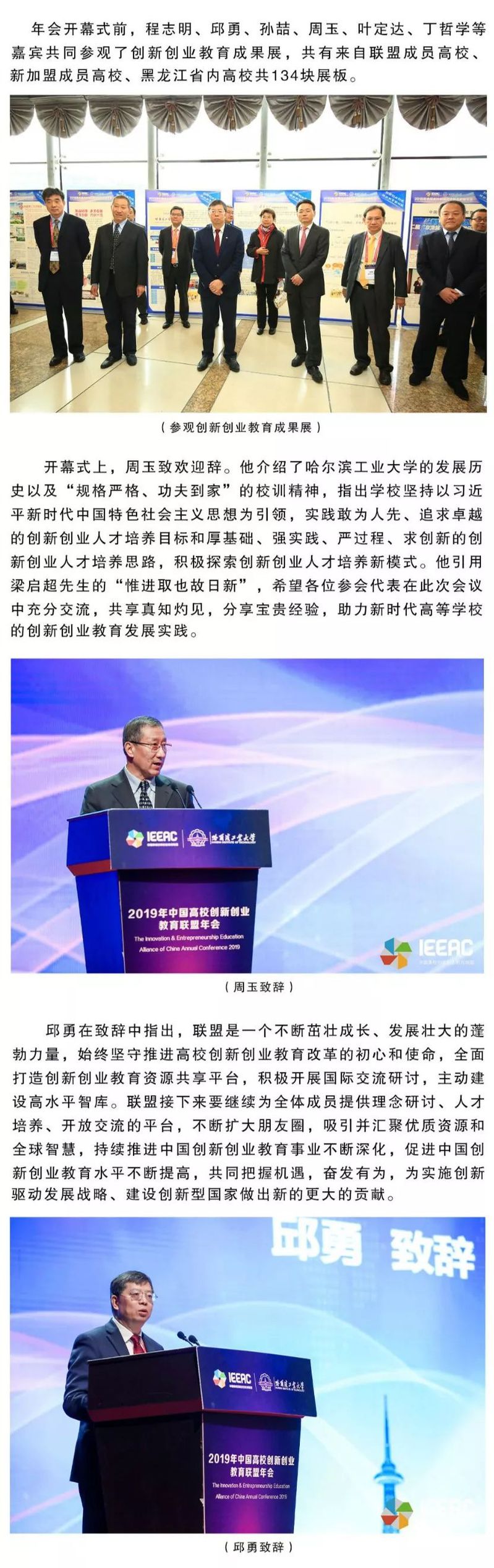 2019年10月20日上午,由中国高校创新创业教育联盟主办、哈尔滨工业大学承办的2019年中国高校创新创业教育联盟年会在哈尔滨市开幕。黑龙江省副省长程志明,中国高校创新创业教育联盟理事长、清华大学校长邱勇,哈尔滨市市长孙喆,哈尔滨工业大学校长周玉,工业和信息化部中小企业局副局长叶定业,黑龙江省教育厅副巡视员丁哲等出席开幕式。创业学院副院长(挂职)高伟代表学校参加本次年会,并在年会上获理事单位授牌,我校正式加入中国高校创新创业教育联盟。