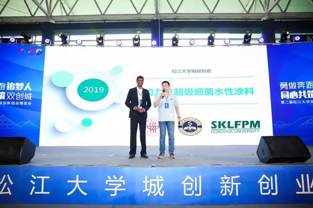 作为优秀参赛创业选手,东华大学博士于海龙现场展示了他的项目:光动力抗超级细菌水性涂料。