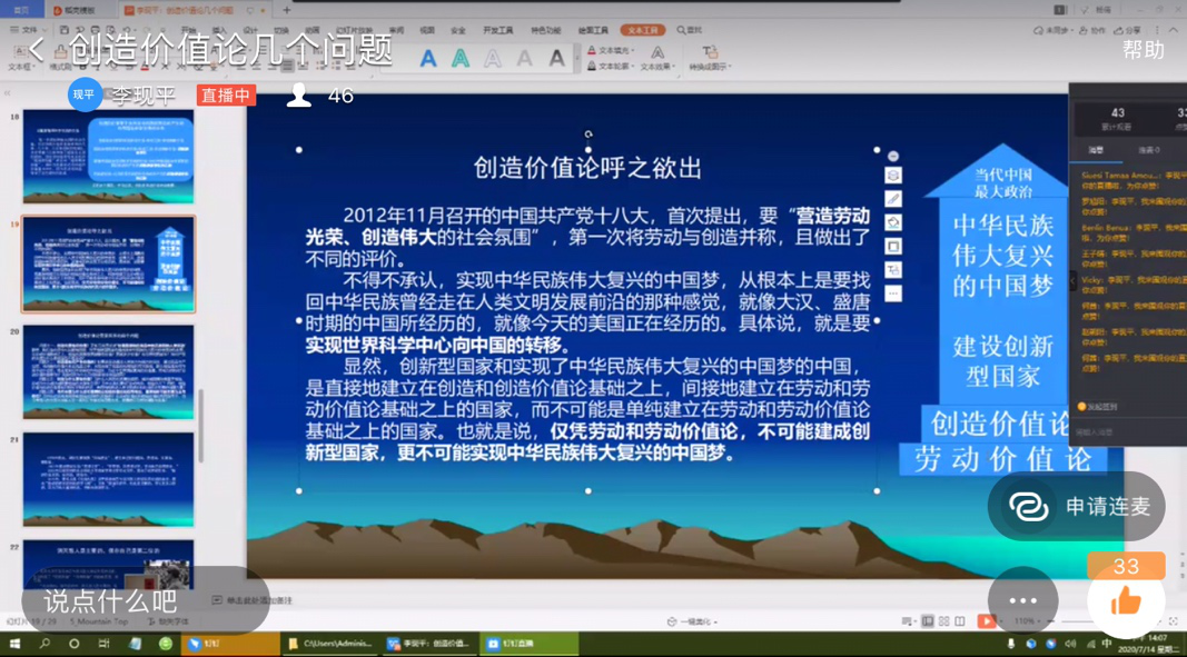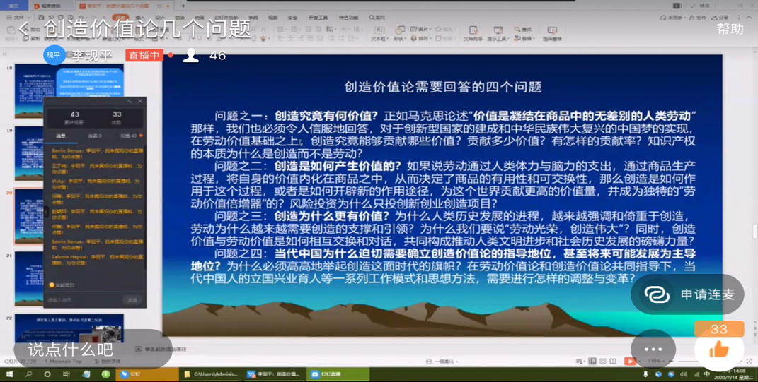 7月14日,博实班进入了第八天的学习。下午1点半,清华大学创意创新创业教育平台x-lab教育研究专家、北京师范大学教育学博士,李现平老师做客博实班直播间,与我们共同分享关于创造价值论的几个问题。讲座开始,李老师首先就一个现实问题“创造在立国兴业育人的价值坐标中处于何种位置”与学员们展开探讨。老师指出劳动价值论告诉我们“价值是凝聚在商品中的无差别的人类劳动。”劳动价值论一直是我国的立国之本、兴业之基、育人之魂。接着,老师向大家解释了20世纪80年代我国出现的“脑体倒挂”现象和创造价值论的时代背景。随后,李老师通过表格向学员们呈现了近代科学史上的“汤浅现象”,即世界科学中心以80年左右为一个周期,在不同的国家之间有规律地转移。