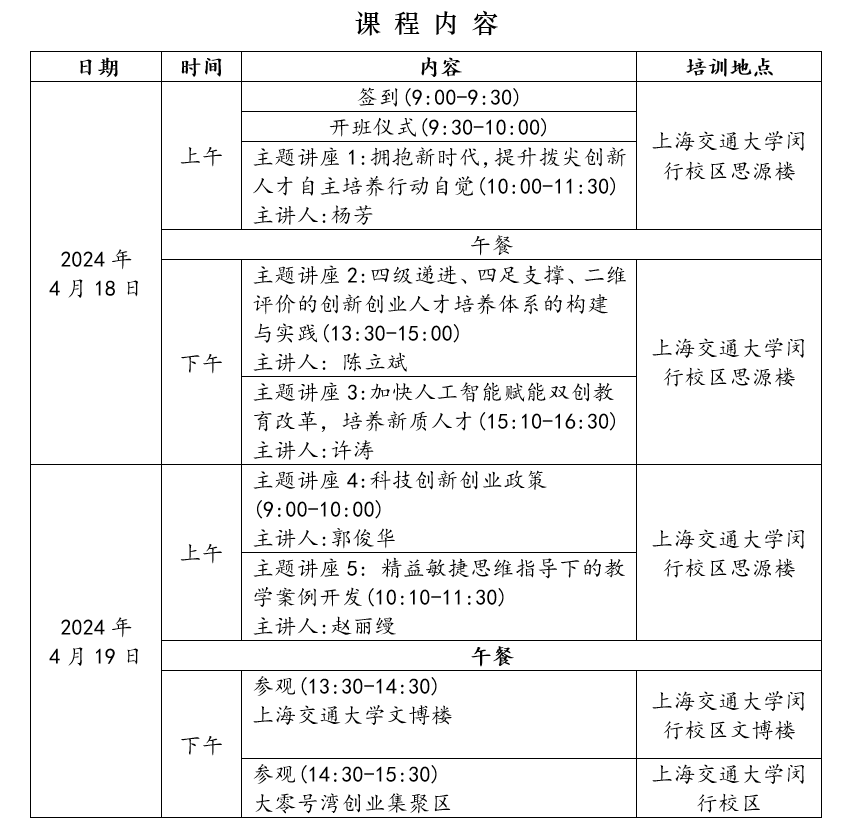 培训班面向上海院校创新创业教育工作部门或机构负责人、学院分管教学工作负责人、专业教师、辅导员及创新创业教育相关人员等,课程内容(详见附件1)。