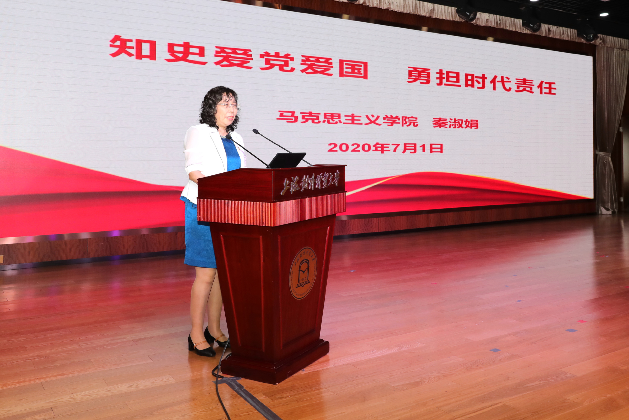 马克思主义学院党总支书记、院长秦淑娟作了《知史爱党爱国勇担时代责任》专题党课。她从“知源头感党恩明责任:学习党史的意义”,“教科书营养剂清醒剂:学习党史的内容”,“守初心强党性展未来:学习党史担使命”三个方面阐释了在党史学习中“为何学、学什么、如何学”等重要问题。