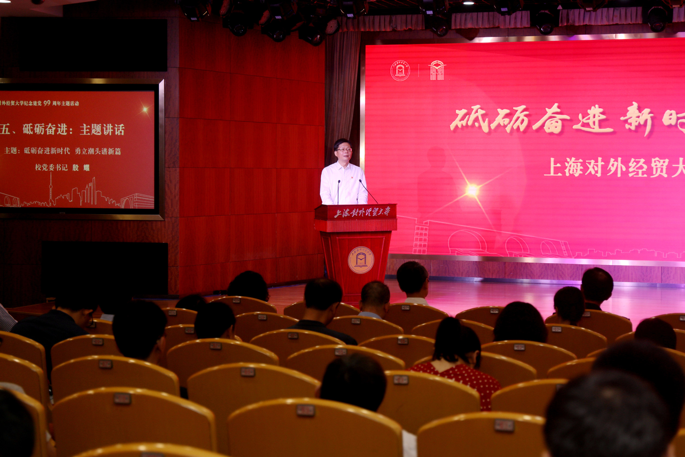 殷耀作《砥砺奋进新时代勇立潮头谱新篇》的主题讲话。他代表学校党委向全体共产党员同志致以节日的问候,并向奋战在抗疫一线、守护校园安全、停教不停学,为学校发展做出贡献的每一位师生员工、每一位党员同志表示感谢。他就进一步加强学校党建工作,加快推进学校事业改革发展谈了三点想法:一是不断提升政治站位,深刻把握学校党建工作面临的形势与任务。他希望全校各级党组织切实以党建为引领,推动和保障学校事业改革发展,促进学校党的建设全面进步、全面过硬。二是不断夯实基层党组织建设,深入推进学校基层党建高质量创新发展。要着力加强“四史”学习教育和基层党支部建设,激发基层党组织活力,提升党员队伍整体素质,压紧压实主体责任,进一步夯实学校基层党建基础。三是不断增强责任感和使命感,凝心聚力推动学校全面深化改革。他强调,各位党员同志要立足岗位,争做学校改革发展的排头兵、先行者,始终胸怀学校事业发展大局,切实发挥先锋模范作用,带着情怀、梦想、责任和担当,用辛勤奋斗创造新历史,用责任担当唱响新赞歌,用真抓实干成就新未来。