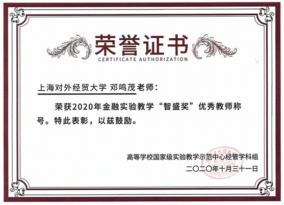 2020年10月31日在浙江嘉兴学院召开的“第二十一届全国高校经管类专业实验室建设暨经济管理实验教学示范中心建设研讨会”上,我院投资系老师邓鸣茂被授予2020年金融实验教学“智盛奖”优秀教师称号。