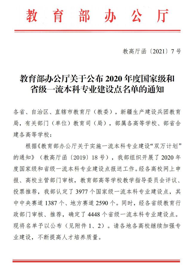近日,《教育部办公厅关于公布2020年度国家级和省级一流本科专业建设点名单的通知》(教高厅函〔2021〕7号)下发。根据《教育部办公厅关于实施一流本科专业建设“双万计划”的通知》(教高厅函〔2019〕18 号),教育部组织开展了2020年度国家级和省级一流本科专业建设点报送工作。经各高校网上申报、高校主管部门审核,教育部高等学校教学指导委员会评议、投票推荐,教育部认定了3977个国家级一流本科专业建设点,其中中央赛道1387个、地方赛道2590个。同时,经各省级教育行政部门审核、推荐,确定了4448个省级一流本科专业建设点。