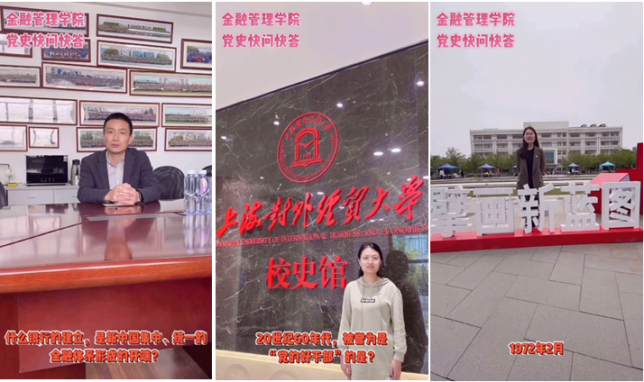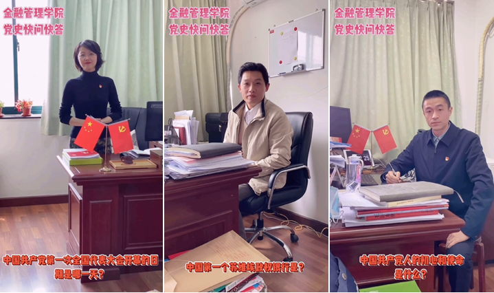 在镜头面前,从学院的书记、院长,到年级的辅导员和班级师生,每一位党员都精神饱满、从容应答。此外,在本次“党史快问快答”学习活动中,金融管理学院师生还在不同的校园场景各自展开了拍摄,办公室、校史馆、信息楼北广场……将党史学习融于工作之中、融于校园文化之中,丰富了党史学习的场景。