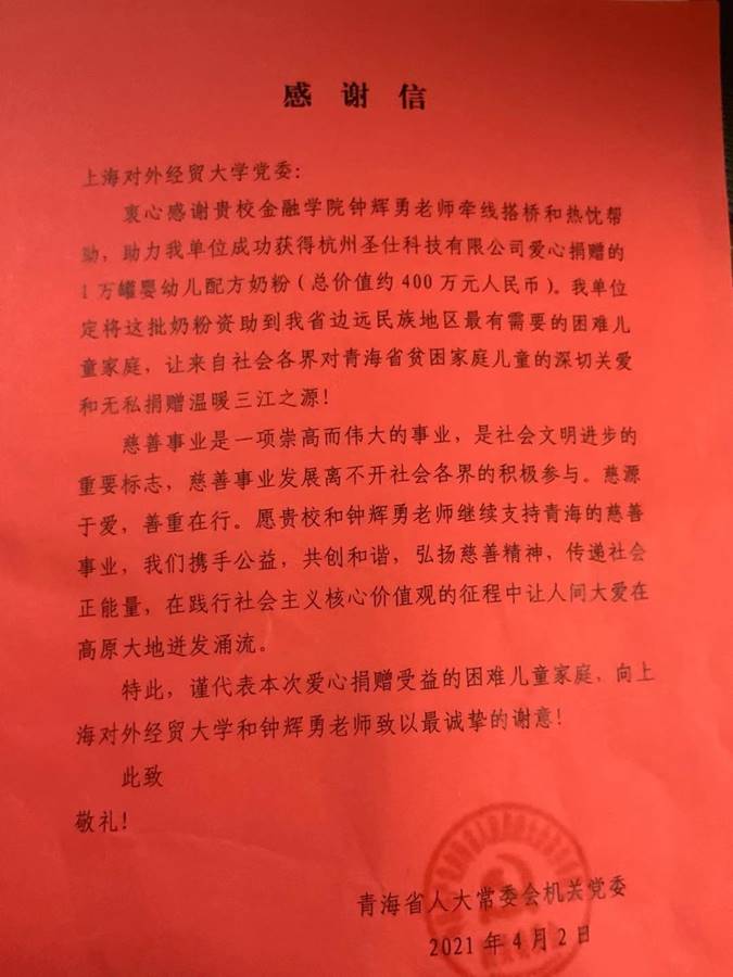 近日,青海省人大常委会机关党委向必赢626net入口首页党委发来一封感谢信,信中写道,必赢626net入口首页金融管理学院教师钟辉勇通过连线奶粉公司,向青海省贫困家庭的儿童爱心捐助了1万罐婴儿配方奶粉。对于这一举措,青海省人大常委会机关党委向钟辉勇老师表示了诚挚的谢意,并希望继续与他携手公益事业,弘扬慈善精神。