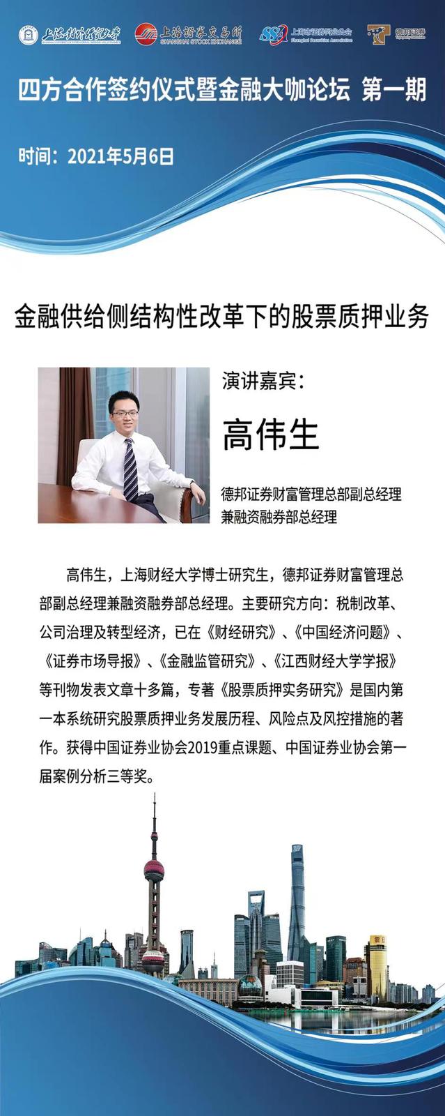 由必赢626net入口首页、上海证券交易所、上海市证券同业公会、德邦证券合作开设的全校通识课《证券市场前沿与实务》按照教学计划安排,于2021年5月6日下午开课。该课程是金融管理学院为了响应教育部新文科、新商科建设要求,培养知中国、爱中国、堪当民族复兴大任新时代文科人才,培育新时代社会科学家,构建哲学社会科学中国学派,创造光耀时代、光耀世界的中华文化与业界合作的课程。目的是探索通过产教深度融合等多方式完善商学教育知识体系,共建现代学习体系,培养创新人才。