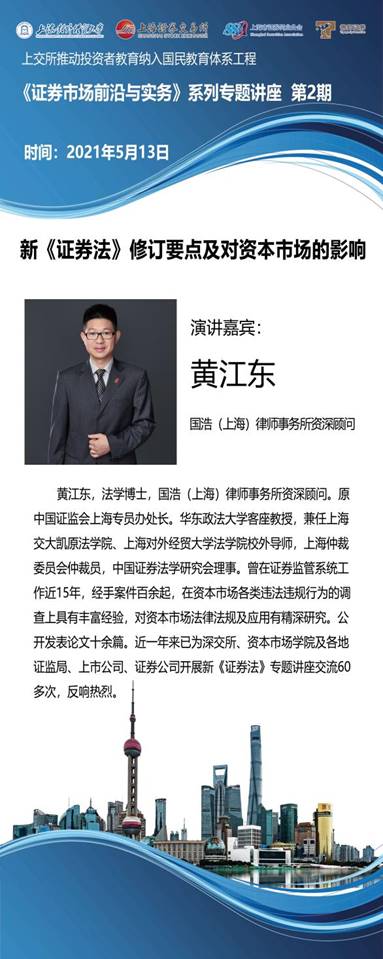 2021年5月13日下午,由必赢626net入口首页、上海证券交易所、上海市证券同业公会、德邦证券合作开设的全校通识课《证券市场前沿与实务》第二期讲座顺利举办。此次讲座由国浩律师(上海)事务所资深顾问黄江东博士为大家带来《新〈证券法〉修订要点及其对资本市场的影响》,来自全校的60余名师生参加了本场专题讲座。