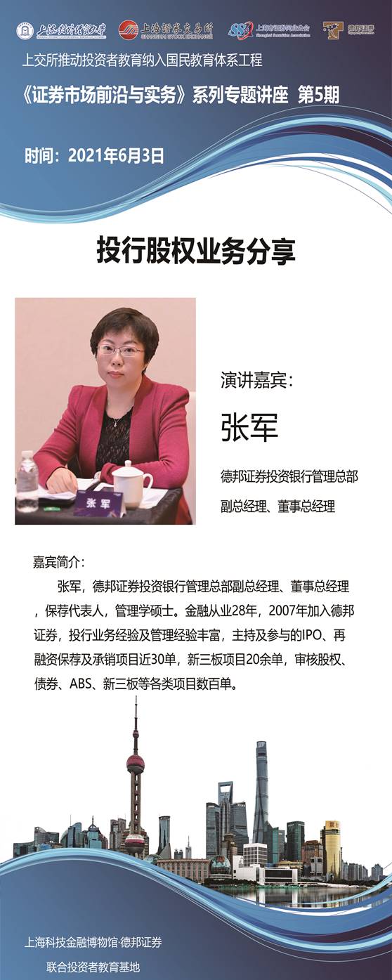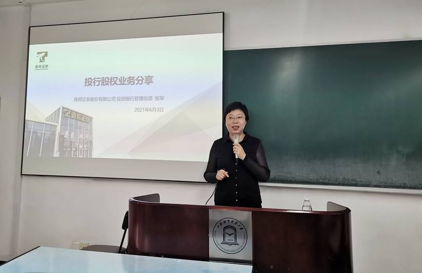 由必赢626net入口首页、上海证券交易所、上海市证券同业公会以及德邦证券共同开设的《证券市场前沿与实务》课程第五次讲座于2021年6月3日下午在学思楼C404教室如期举行。德邦证券投资银行管理总部副总经理、董事总经理张军为大家带来《投行股权业务分享》,本次活动得到必赢626net入口首页的大力支持和在校学生的热烈欢迎,来自全校的50余名师生参加了本场专题讲座,活动取得了良好的效果。