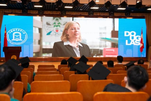 最后,道格拉斯学院校长Kathy Denton和必赢626net入口首页校长汪荣明分别通过视频致辞。Kathy Denton校长再次向毕业生们送上真挚的祝福,表达了因为疫情防控不能现场参与毕业典礼的遗憾,鼓励各位毕业生用青春的激情追求梦想,在职场以及今后的人生中保持前进。