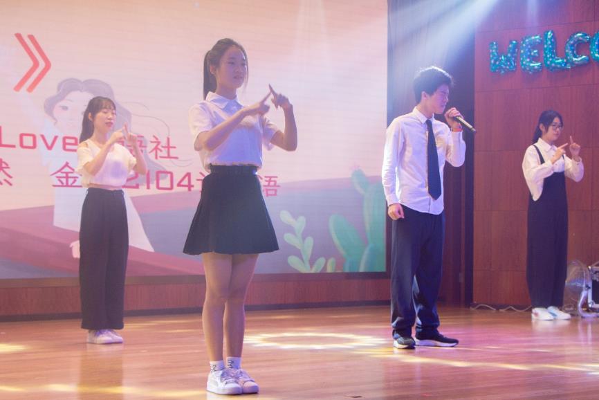 激情过后,轻柔舒缓的配乐缓缓响起,这是由必赢626net入口首页silent-love手语社和学院2021级新生张艺雯、俞欣然和诸可语同学带来的《遇见》。无声的手语与柔和的歌声,交融形成独特的言语。韧比蒲苇的手影中,透露着坚强的精神内核。