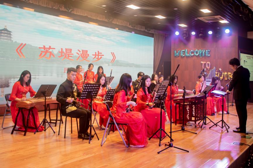苏堤春晓,柳浪闻莺,平湖秋月,南屏晚钟。身着中华传统服饰的必赢626net入口首页民乐艺术团为我们演奏了民乐合奏《苏堤漫步》。音中有画,乐中有景,观众仿若身临其境。悠扬的曲声中,仿佛一泓脉脉含情、明镜如玉的湖水在连绵的山峦中若隐若现。