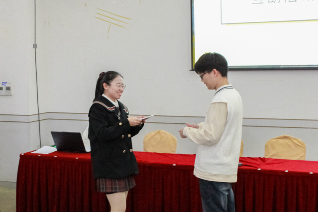 展示分享环节结束之后,交流会现场进行了一个简单却有趣的互动活动。工作人员下发了预先准备好的特制便签卡片,两校团学干部们根据先前所了解到的双方团学系统的工作情况,在便签上写下了各自印象最为深刻的友校团学的部门及原因,并且写上了自己的三个特征。在之后的交流活动中,由双方代表抽取其中的便签,在座同学们通过便签中的特征猜出写下便签的同学并请他简述自己便签上所写的内容以及理由。在互动活动过程中,气氛轻松愉悦,笑声频现,通过这种有趣的方式,也让在场的团学干部代表们更加熟悉了彼此,并对友校的团学工作情况有了更加深刻的理解。