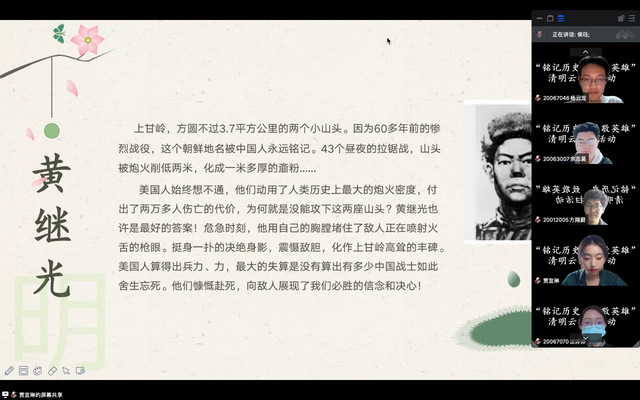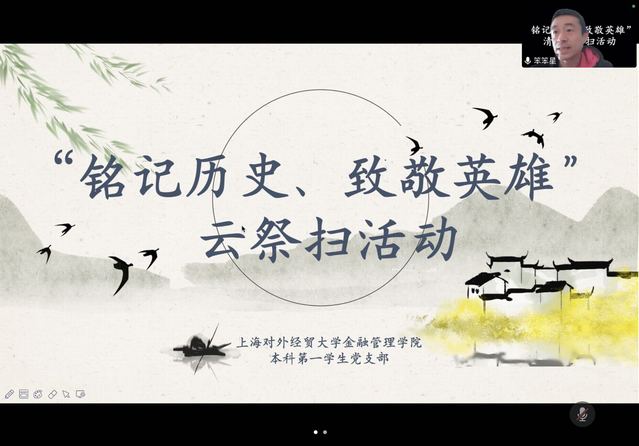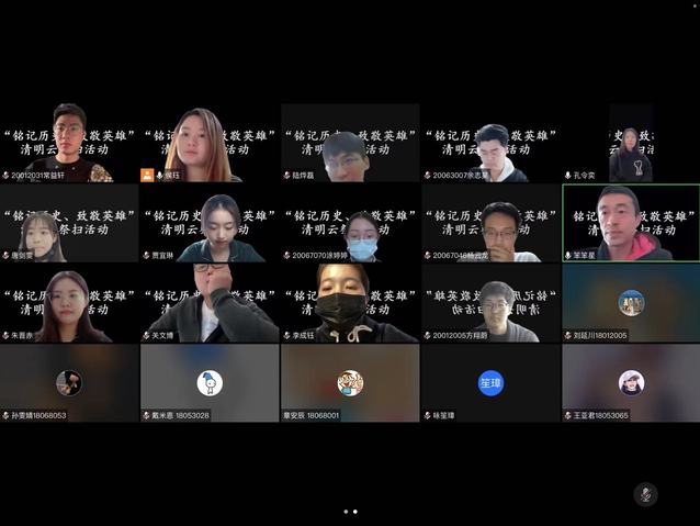 清明时节是我们缅怀先辈,寄托哀思之时。为响应防疫要求、减少人员聚集,缅怀革命先烈,弘扬民族精神,学院本科第一学生党支部借助“腾讯会议”的平台,开展了“铭记历史、致敬英雄”清明云祭扫活动,纪念在伟大抗美援朝战争中经历艰苦卓绝的浴血奋战,为国牺牲,做出巨大贡献、赢得抗美援朝战争伟大胜利的中国人民志愿军战士。学院党委副书记冯昕、支部书记侯珏以及其他四位支委和支部20余名学生党员和入党积极分子共同参加活动。