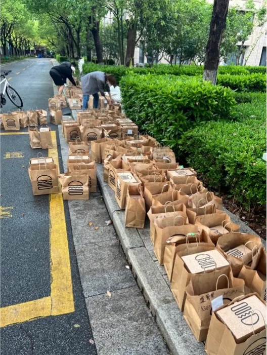 一个多月里,不管是清晨5点半还是夜里23点到货,不管是1000斤的蚕豆,800斤的茭白,一卡车菌菇,还是以千计的面包与牛奶,团长们都兢兢业业守候在社区门卫处,清点货物,监督门卫对货物进行全方面消杀,将货物从门口搬到小区内并组织居民们有序排队领取。