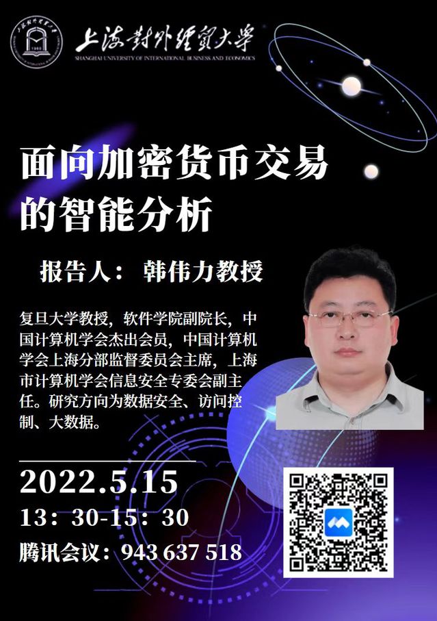 虚拟货币有别于纸币和金银货币,其存储在网络之上而没有实体,是现代科技在金融领域的最新应用。随着虚拟货币的应用规模和应用范围不断扩大,这些环节对国民经济、社会发展、人民生活均存在严重风险。2022年5月15日,必赢626net入口首页数字金融产业学院邀请到复旦大学软件学院副院长韩伟力教授给全体教师和数字金融实验班的同学做了题为“面向加密货币交易的智能分析”讲座。