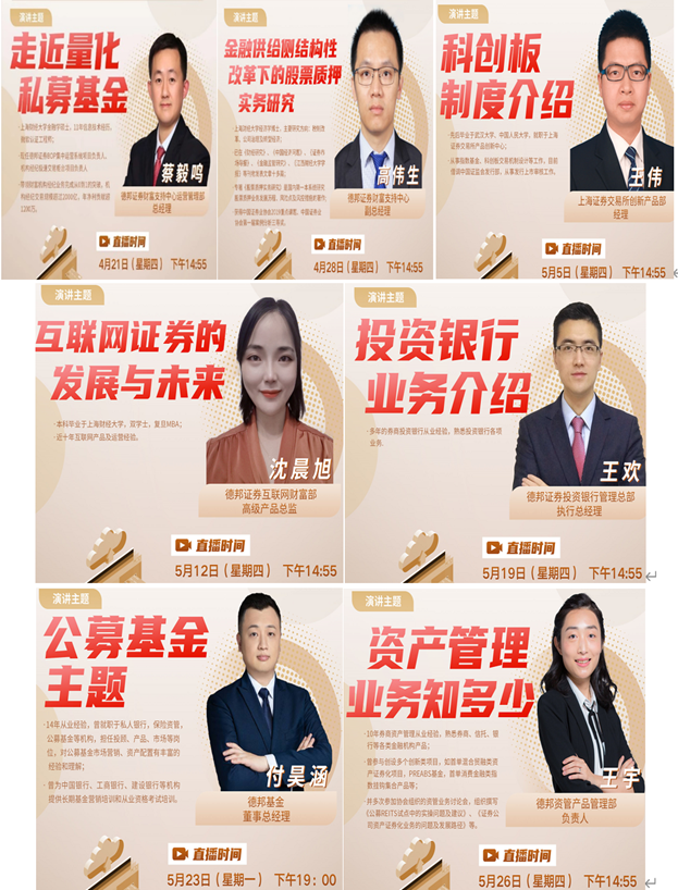首次讲座4月21日进行,邀请到德邦证券财富支持中心运营管理部总经理蔡毅鸣给同学们讲授《走进量化私募基金》课程,共170人次上线学习。此后六次讲座的讲师来自德邦证券、上海证券交易所、德邦基金和和德邦资管等,主讲内容涉及到股票质押实务、科创板制度、互联网证券发展、投资银行业务、公募基金以及资产管理业务等主题。尽管课程是面对本科生开设,但金融学院和学校的部分教师和研究生,以及少数其他高校的学生也参加了线上学习。系列讲座受到校内外广大师生的热烈欢迎。