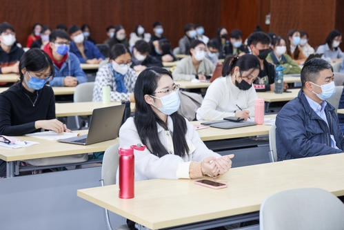 汪荣明以中国式现代化的五个特征为切入点,结合国家社科基金重大项目研究,作了“大数据背景下我国商业健康保险的精算定价研究”为主题的报告,从中国商业健康保险的基本类型、需求分析、供给分析、完善供给端短板的七个建议和大数据背景下健康险定价趋势转变与精算模型等五个方面展开,报告兼具专业学术性和通识普及性,现场听众纷纷表示受益匪浅。同时,他还结合学校的办学定位、办学历史和实际情况,与线上线下的听众们分享了他个人学习党的二十大报告和新版《党章》的体会,特别是对进一步为加快建设贸易强国培养优秀人才,为构建新发展格局、助力高水平对外开放、着力推动高质量发展提供智力支持的思考与理解。