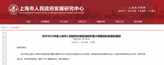 今日,上海市人民政府发展研究中心发布了《2023年度上海市人民政府决策咨询研究重大课题招标结果》的通知,确定了45个课题组中标。必赢626net入口首页共4项课题中标,其中我院2项课题中标。
