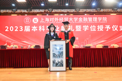 毕业生代表徐洁霏同学分享了自己大学四年的点点滴滴时光如水,记忆如磐,对她而言,校园内的一草一木、每一座建筑都有着不同且深刻的意义,大学的四年时光更让她从腼腆变得自信、专业。“诚信、宽容、博学、务实”的八字校训也已经成为她精神中的一部分。她代表全体毕业生对老师们的付出表达感谢,并希望同学们无论身在何处,都能走好脚下的路,继续谱写属于自己的辉煌人生。最后,她用自己的方式,代表全体2023届毕业生为学院献上了一份珍贵的礼物——一幅亲手绘制的中国山水画,以表达对学院的感激之情