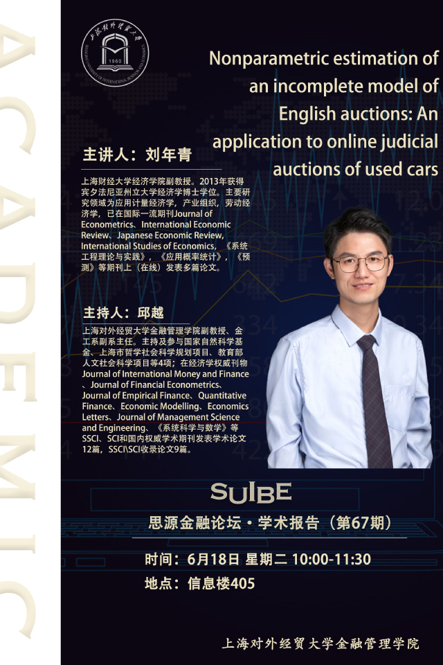 【 SUIBE思源金融论坛——学术报告第67期 】Nonparametric estimation of an incomplete model of English auctions: An application to online judicial auctions of used cars