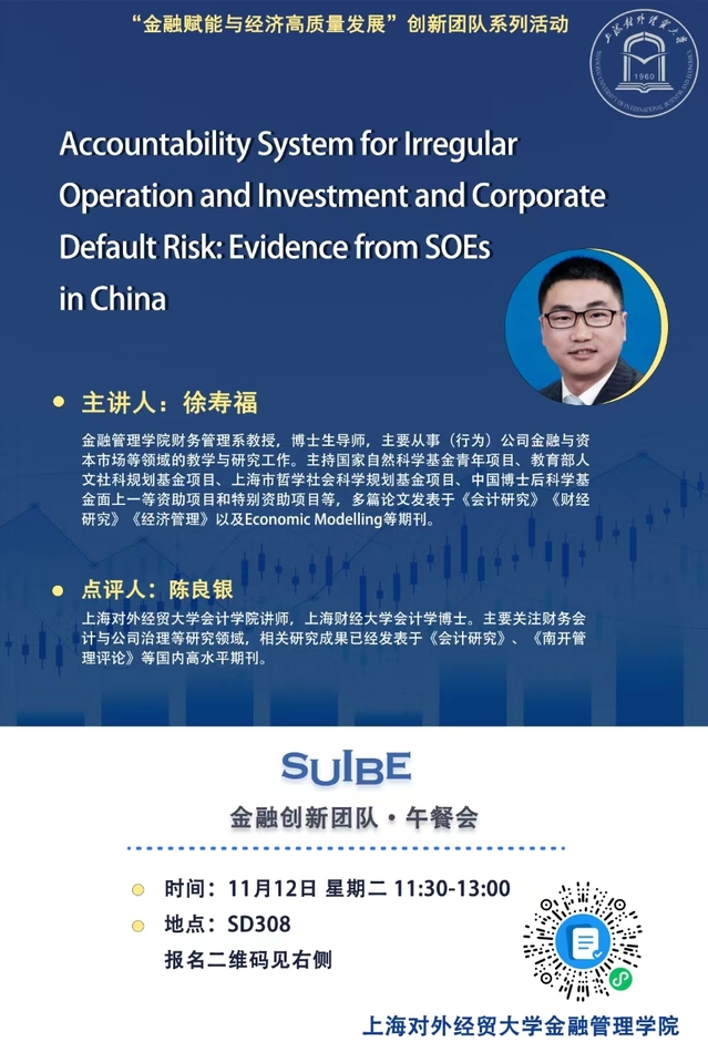 【学院创新团队活动丨午餐会】Accountability System for Irregular Operation and Investment and Corporate Default Risk: Evidence from SOEs in China