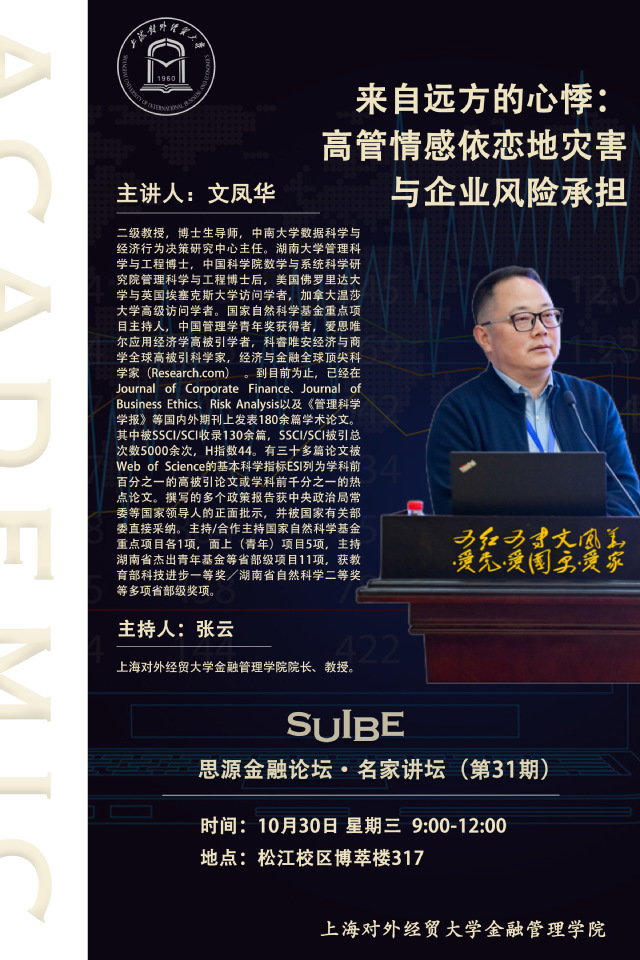 【SUIBE思源金融论坛——名家讲坛第31期】来自远方的心悸:高管情感依恋地灾害与企业风险承担