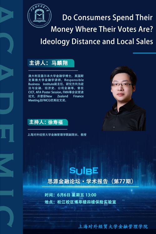 【思源金融丨学术报告第77期】马麟翔 Do Consumers Spend Their Money Where Their Votes Are? Ideology Distance and Local Sales