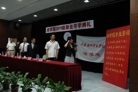 典礼上,黄洁老师代表全体教师发言,作为贸院的校友,她结合自己在美国杜克大学求学的经历,对同学们提出了宝贵的建议,并希望同学们今后成为“有爱”的法律人,报效祖国。老生代表10级本科生孙伟男、10级研究生赵文越、新生代表本科生沈浥洳、研究生宋良艳也先后发言。