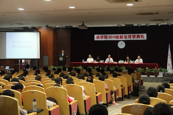 陈晶莹院长首先致辞,她代表法学院全体教职员工对2011级288位新成员的到来表示祝贺。陈院长向同学们介绍了法学院的办学历史,“博学、审问、慎思、明辨、笃行”的学风,“两懂一精通”的人才培养模式、基础教育与实践教学以及国际化办学相结合的办学方向和特色。她强调英语学习及其应用是大学学习的重点,自主学习则应当成为大学的主旋律。她希望同学们合理定位、严谨治学、修身养性,做一个身心健康、善于宽容、乐于奉献、勇于担当、有理想有抱负的年轻人。