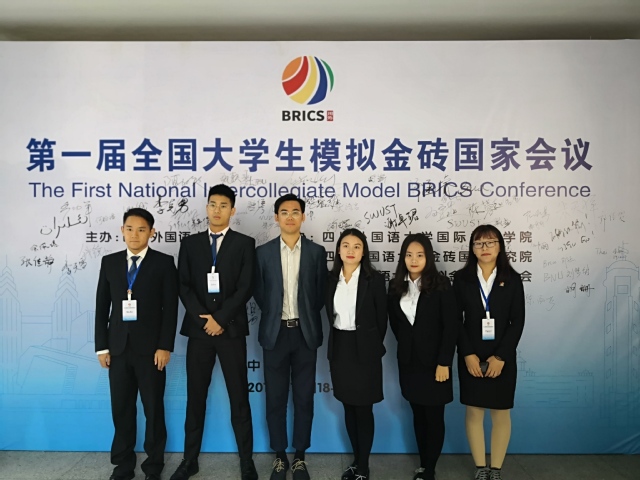 2019年10月18-20日,首届全国大学生模拟金砖国家会议在四川外国语大学举行。我院2017级国政专业学生陈蓉、陈加敏、殷崇耀、何盼盼以及岑熠代表学校团体参加,国际关系学系连波老师带队。