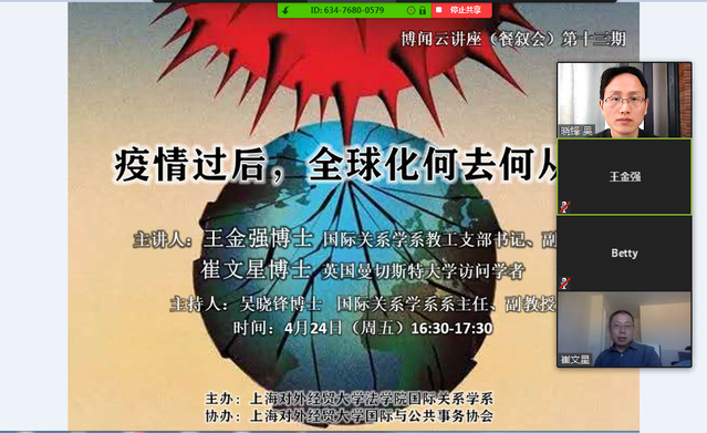 2020年4月24日,国际关系学系第十三期“博闻餐叙会”以云讲座的形式如期而至。国际关系学系教工支部书记、副教授王金强博士和目前正在英国曼彻斯特大学访学的崔文星博士作为联合主讲人,就“疫情过后,全球化何去何从”的主题分享各自的观点和看法,国际关系学系主任吴晓锋副教授主持讲座。法学院国政专业学生、毕业校友及相关专业师生六十余人参加了本次云讲座。