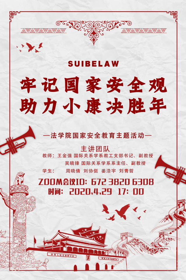 为认真贯彻落实习近平总书记关于国家安全的重要论述,牢固树立总体国家安全观,结合当前疫情防控工作,推进国家安全教育进校园、进课堂,法学院于4月29日在线上开展了“牢记国家安全观、助力小康决胜年”国家安全教育主题讲座。讲座由学院团委副书记王元昆主持,本次主讲团队由国际关系学系教工党支部书记王金强、国际关系学系主任吴晓锋,以及周晓倩、刘协侹、姜浩宇和刘青哲四名同学组成。