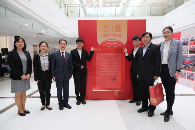 上海市政协副主席、法学院名誉院长、杰出校友周汉民在建校60周年纪念大会暨“上海开放经济论坛”开幕式大会上致辞。周汉民深情回忆了与母校共同走过的40多年心路历程,他将母校波澜壮阔的60年发展历史比作一首“澎湃、壮丽而引领未来的歌”。他指出,母校博大的胸怀和格局,造就了8万多名国际经贸人才。母校就如同日月星辰照亮广大上经贸大学子的人生,所有上经贸大学子一辈子都应该努力奋斗,为母校争光。周汉民回顾了在浦东开发开放早期研究、中国复关入世决策咨询、申请和筹办世博会、推进自贸区建设等重要工作中所作出的贡献,表示自己所取得的每一个成就都离不开母校深远的影响。“诚信、宽容、博学、务实”的校训是母校给上经贸大人最好的哺育和教诲,需要每一位上经贸大人用一生去践行的要求。最后,周汉民号召全体上经贸大校友共同为祖国现代化强国建设和中华民族伟大复兴努力奋斗。大会结束后,周汉民在其倡议起草的法学院学生誓词宣誓人处签名并合影留念。