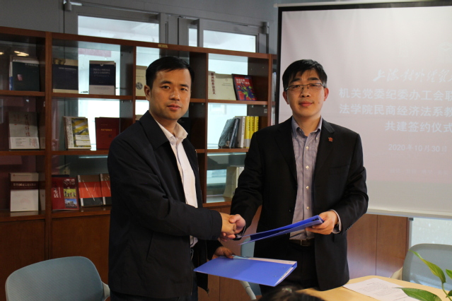 2020年10月30日中午,机关党委纪委办与工会联合党支部和法学院民商经济法学系教工党支部在钟书阁党建活动室举行支部合作共建活动,校党委副书记、纪委书记许玫,机关党委副书记毛丹玲,法学院党委副书记陈雪,纪委办与工会联合党支部书记唐旭生,民商经济法学系教工党支部书记王诚,共建支部全体党员参加活动。