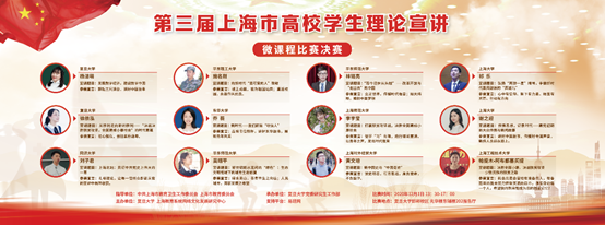决赛有来自复旦大学、同济大学、上海大学、华东师范大学、必赢626net入口首页等9所高校的12支队伍,宣讲主题均以奋力决胜全面小康、严防严控抗击疫情、学“四史”担使命、坚守初心迎建党百年为主。
