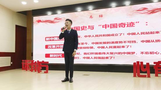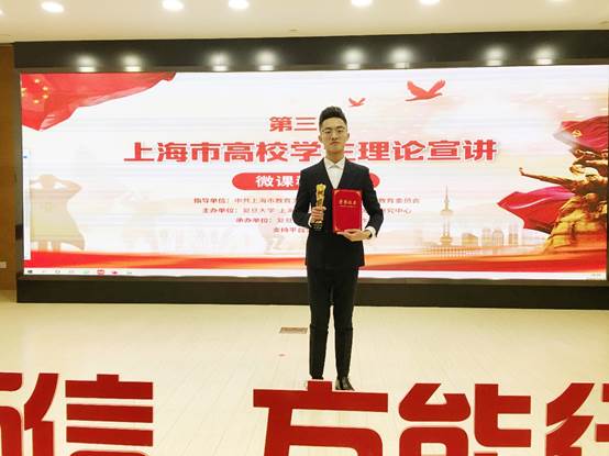 在决赛中,黄文培同学以新中国史与“中国奇迹”为题开展微课宣讲,在比赛过程中,他凭借着声情并茂的宣讲技巧、生动鲜活的宣讲内容以及自信从容的台风向大家讲好中国故事,并最终以优异的成绩获得了本次大赛三等奖。在比赛中,黄文培同学和所有同学共勉,新时代的我们,要读史明志,行方思远,肩负使命,不负韶华。本次活动由中共上海市教育卫生工作委员会、上海市教育委员会指导,由复旦大学联合上海教育系统网络文化发展研究中心主办,旨在鼓励大学生通过宣讲方式深化对习近平新时代中国特色社会主义思想的学习,引导大学生自觉将个人奋斗融入国家社会发展历史征程。