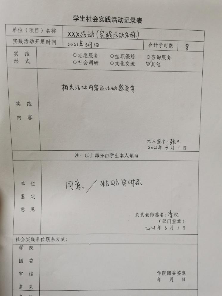 1. 单位鉴定意见:由开展社会实践的有关单位填写鉴定意见,不得空白,并由负责老师签名或盖上单位公章。也可于“单位鉴定意见”处粘贴有公章的学时“证明条”或实习证明,但必须保证粘贴件为原件而不是复印件,学院团委将对相关页面进行学时认定。