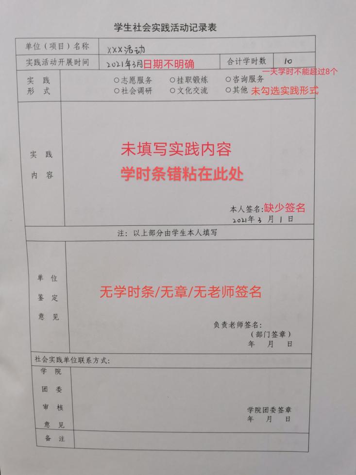 学生每次参加各种类型的社会实践后,由学生本人和接受学生开展社会实践的有关单位填写《社会实践记录册》。学生与相关单位应严格按照下述规范进行填写,否则不予认定学时。