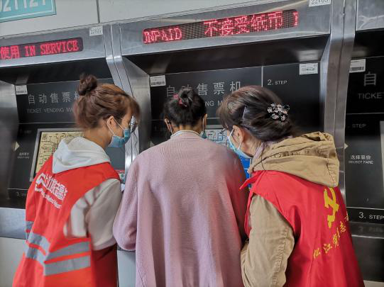 在“松江大学城地铁站”志愿者活动中,志愿者们穿梭在人海中引导乘客安全通过安检口和闸机口,帮助乘客使用自动售票机和加值机,为乘客指引线路等;